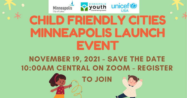 The event will take place on Zoom, on November 19, 2021, at 10:00 AM Central, to celebrate the launch of Child Friendly Cities Initiative in Minneapolis. The United States is the only United Nations member nation that has not ratified the United Nations Convention on the Rights of the Child, but Minneapolis is on its way to becoming one of the first CFCI cities in the U.S.