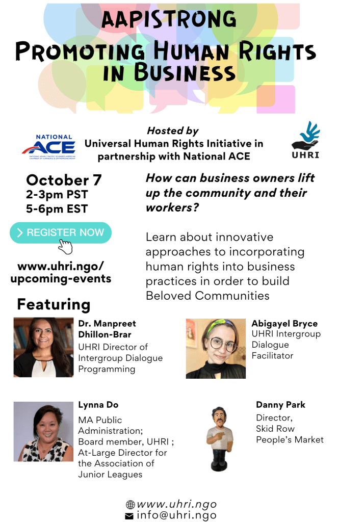 Promoting human rights in businesses: How Can Business Owners Lift Up the Community and Their Workers? by hreusaOctober 6, 2022Leave a comment Register here! Friday, October 7, 2-3pm PST, 5-6PM EST Share Click to email a link to a friend (Opens in new window) Email Click to print (Opens in new window) Print Click to share on Facebook (Opens in new window) Facebook Click to share on LinkedIn (Opens in new window) LinkedIn Click to share on X (Opens in new window) X