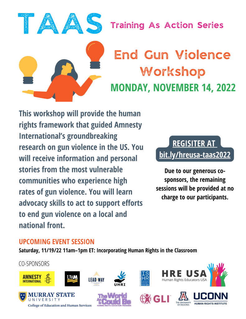 You have the right to live free from gun violence. The impact of the gun violence in the United States (US) has created a human rights crisis by denying people their civil and political rights, including their right to live, right to security of person, right to be free from discrimination and equal protection of the law. Gun violence also undermines the enjoyment of economic, social, and cultural rights, including the right to health and the right to education. The US has a legal obligation to respect, protect and fulfill these human rights as it has signed or ratified five International human rights conventions.
