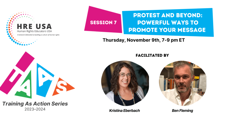Human Rights Educators USA’s annual Training as Action Series (TAAS) is a virtual training series focused on bridging personal and collective action on some of the most critical human rights issues of today. TAAS creates an educational space to connect and collaborate with others in human rights education and training. It also gives participants the skills and information needed to take action on rights issues in their communities. The 2023-2024 training series will celebrate the 75th anniversary of the Universal Declaration of Human Rights (UDHR) and center on the theme, “Protecting Democracy, Promoting Human Rights.” Sessions will discuss topics such as voting rights, facilitating difficult conversations, organizing an advocacy campaign, communicating with decision makers, protesting, and mental wellness.