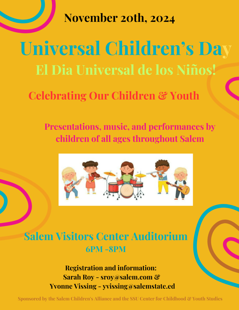 The City of Salem and the Center for Childhood & Youth Studies at Salem State University will be holding a set of celebration events on November 20, which is Universal Children’s Day. The day events will include presentations from UNICEF and speakers from around the world on how a city like Salem could become designated as a Child Friendly Community, followed by in person workshops on what we together can do to make that happen.