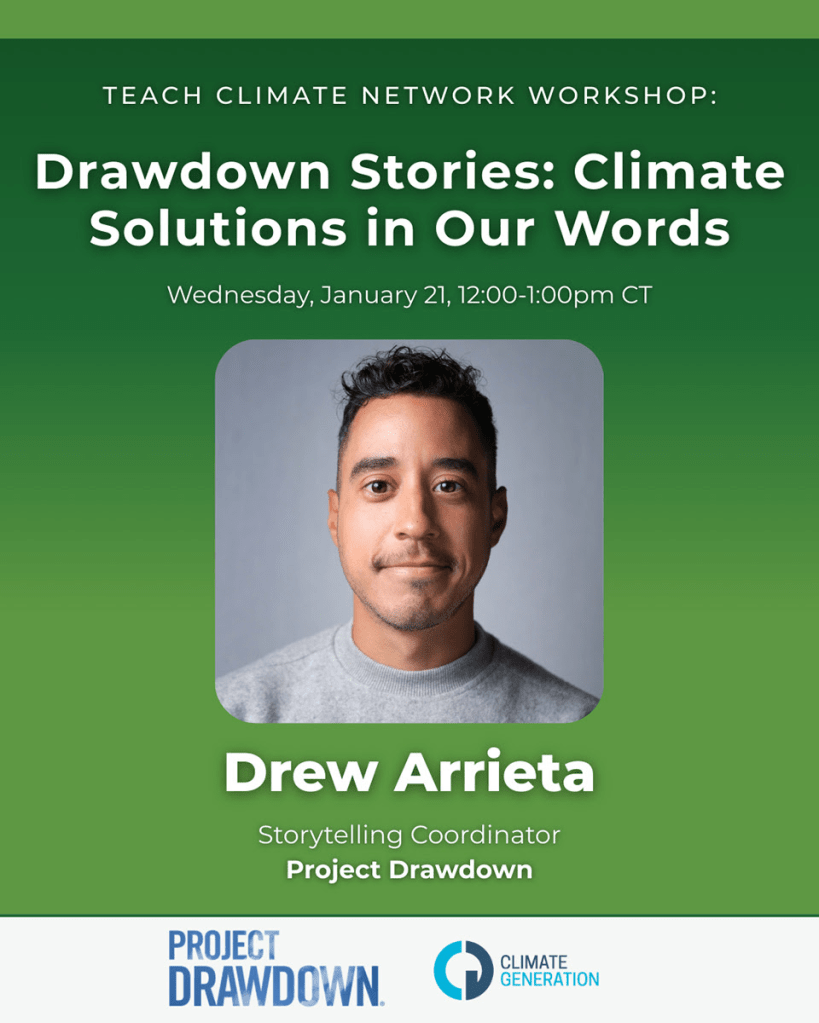 Join the Teach Climate Network and Project Drawdown’s Storytelling Coordinator Drew Arrieta on January 21 from 12:00 – 1:00 pm CT for a workshop exploring how personal narratives can bring climate science down to earth: making it human, local, and real. Drawing from Project Drawdown’s Neighborhood Storytelling Work, we’ll look at examples of how everyday people are shaping climate solutions. Participants will leave with a clearer sense of their own climate story and how to share it with courage and care.