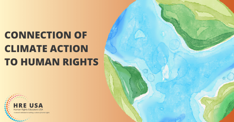 We’ve created a new set of resources in our HRE & Linkages series: Climate Action and Human Rights Education (HRE) are interconnected. The linkages are explored through this slide deck and this lesson plan, which expands on how to teach about the impact of climate change, understand the connection of these impacts to climate change, and how to take action to address these impacts. These issues are also discussed in Human Rights Here and Now, Bulletin #11.