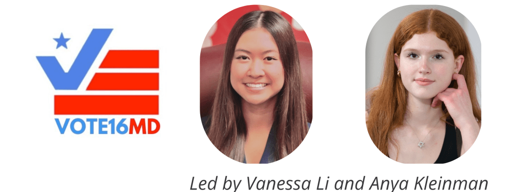 Vote16MD works to lower the voting age to 16 across Maryland’s municipalities, with the broader goal of empowering youth and encouraging lifelong civic engagement. Part of Vote16USA, a national youth-led movement to extend voting rights, Vote16MD works alongside lawmakers to develop and implement Vote16 policies. Already 20 Maryland cities have lowered the voting age. Led by Vanessa Li and Anya Kleinman, chapters of Vote16MD research the policies of their local townships and counties, lobby elected representatives and municipal election boards, raise community awareness about the importance of youth voting rights, and engage and empower young people to make their voices heard.