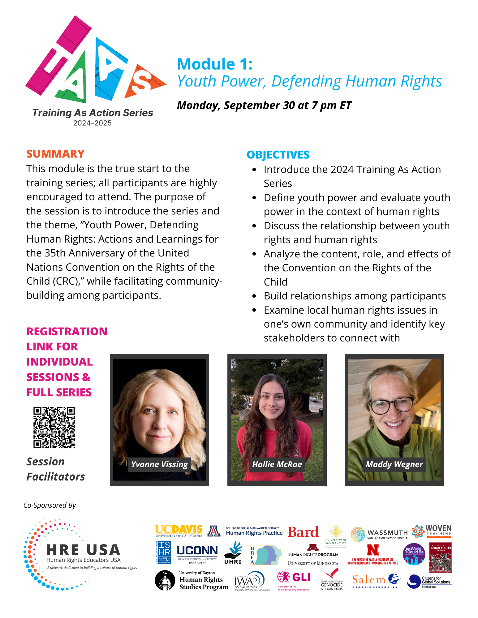 The theme of the 2024-2025 training series is: “Youth Power, Defending Human Rights: Learnings and Actions for the 35th Anniversary of the Convention on the Rights of the Child (CRC).” Sessions will discuss topics such as youth rights, the CRC, education as a tool for empowerment, international youth solidarity, the theory of change, digital citizenship, and mental wellness.