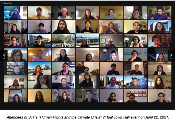 As part of HRW Student Task Force’s (STF) advocacy to transition high schools across Southern California to 100% renewable energy, commit to energy efficiency plans, and engage in climate justice education, the STF hosted over 150 students, teachers, administrators, and community members at the “Human Rights and the Climate Crisis” Virtual Town Hall on Earth Day 2021.