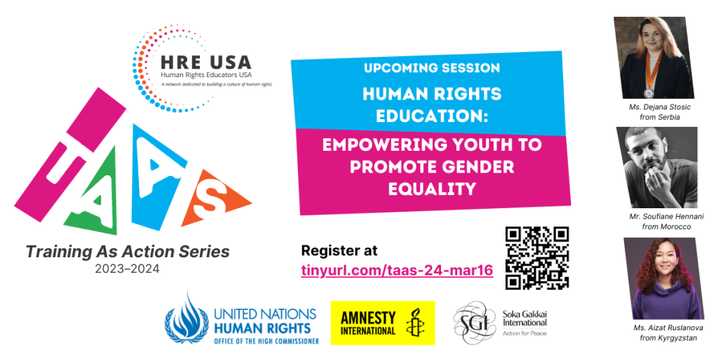 Human Rights Educators USA’s annual Training as Action Series (TAAS) is a virtual training series focused on bridging personal and collective action on some of the most critical human rights issues of today. TAAS creates an educational space to connect and collaborate with others in human rights education and training. It also gives participants the skills and information needed to take action on rights issues in their communities. The 2023-2024 training series will celebrate the 75th anniversary of the Universal Declaration of Human Rights (UDHR) and center on the theme, “Protecting Democracy, Promoting Human Rights.” Sessions will discuss topics such as voting rights, facilitating difficult conversations, organizing an advocacy campaign, communicating with decision makers, protesting, and mental wellness.