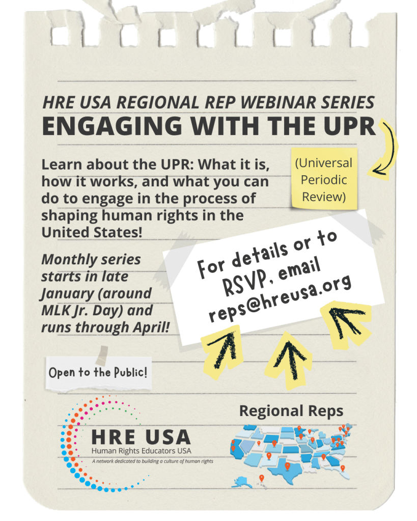 Calling all human rights educators and advocates! The members of the HRE USA Regional Reps are coordinating a series of webinars to move from theory to transformation to assist, support, and collaborate to bring collective, local actions to the United States’ 2026 Universal Periodic Review of Human Rights.
