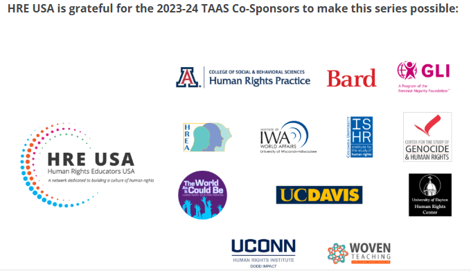 The Human Rights Educators USA’s virtual Training As Action Series (TAAS) focuses on bridging personal and collective action on some of the most critical human rights issues of today. The annual series is offered each year between September and April.